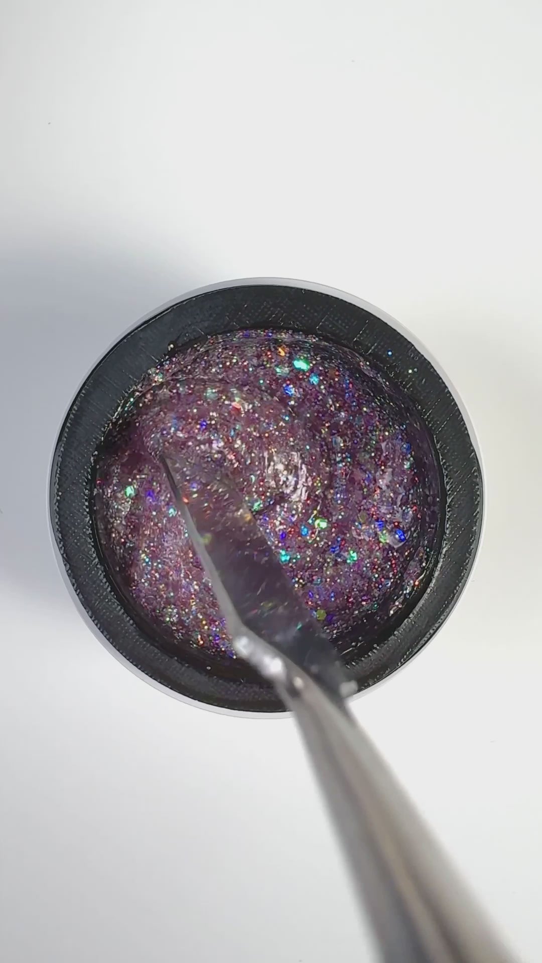 A blend of small lavender glitter with larger iridescent pieces throughout. It will give you a soft, sweet look and applies perfectly over pinks, lavenders and purples.